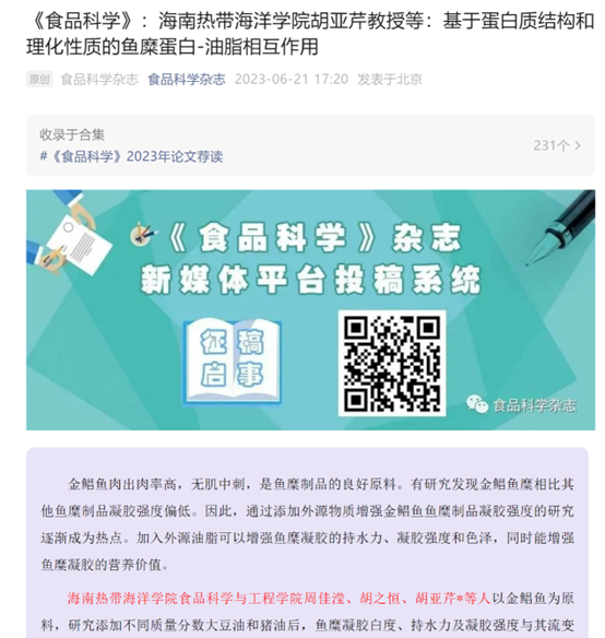 我校食品科学与工程学院教授胡亚芹团队最新研究成果“基于蛋白质结构和理化性质的鱼糜蛋白-油脂相互作用”被国内食品领域顶级中文期刊《食品科学》录用。鉴于论文研究结果为同行评审高度认可,《食品科学》杂志作为热点文章在其官微上公开发文荐读。