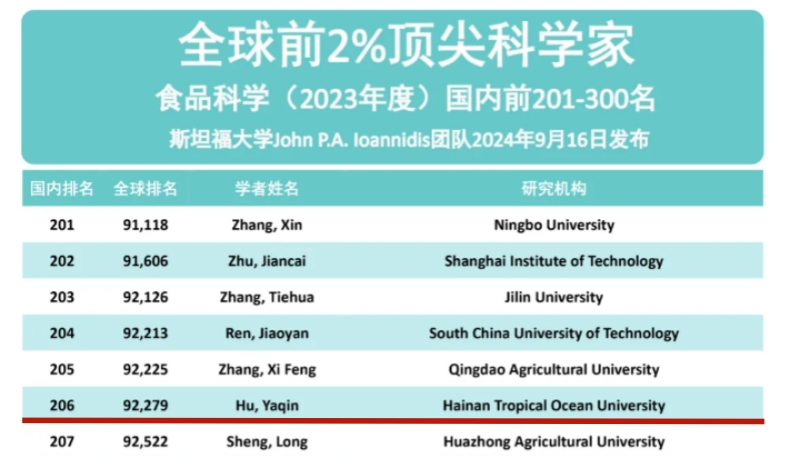 我校食品领域教授胡亚芹荣列榜单,这也是其作为我校优秀科研人员的代表,让海南热带海洋学院2021、2022及2023年度连续三次荣登全球前2%顶尖科学家榜单。极大提升了我校食品学科在全球的学术影响力,为我校服务海南自由贸易港建设、提升国际影响力作出积极贡献。