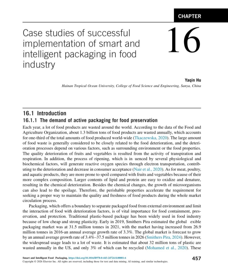 胡亚芹在该书中独立撰写了第16章Case studies of successful implementation of smart and intelligent packaging in food industry(食品工业中智能与活性包装成功实施案例研究),聚焦基于果胶多糖的活性包装体系,系统阐述了其在水果、蔬菜、肉类、水产品及乳制品保鲜中的应用效果与技术机理,展示了其在延长食品货架期、减少食品浪费方面的显著优势。该章节内容兼具学术深度与应用价值,体现了胡亚芹在食品活性包装与生物高分子材料领域的深厚积累与研究实力。