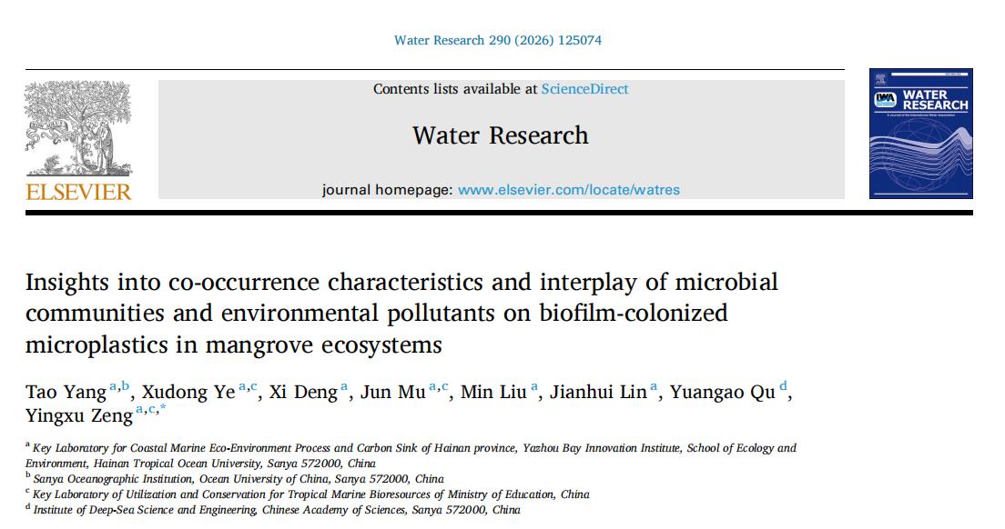 近日,生态环境学院曾映旭教授团队在国际环境领域顶级期刊Water Research(中科院I区TOP,Nature Index期刊,IF=12.4)上发表了立足于海南自贸港国家生态文明试验区建设的研究成果Insights into co-occurrence characteristics and interplay of microbial communities and environmental pollutants on biofilm-colonized microplastics in mangrove ecosystems,揭示了典型热带海洋生态系统中生物膜微塑料协同富集微生物、重金属及持久性污染物的复杂过程与驱动机制。该期刊由国际水协会(International Water Association)主办,创刊于1967年,是环境科学与生态学领域最具权威性的期刊之一。