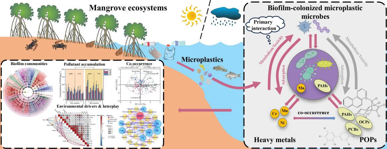 研究通过在海南沿岸红树林生态系统中开展原位暴露实验,系统探究了不同红树林生境、季节、暴露时间及塑料类型下,微塑料表面生物膜中微生物群落与重金属、持久性有机污染物的共赋存特征与耦合作用机制。研究发现,红树林中微塑料表面生物膜作为一个复杂载体和动态界面,显著增强其对重金属和有机污染物的吸附与富集能力,且此过程与微生物多样性的变化动态耦合。其中,地理位置是塑造生物膜微生物群落结构及污染物富集模式的最强驱动因素,其影响远超季节变化,表明局部环境条件与人为活动压力是决定微塑料环境行为的关键。此外,首次揭示了重金属与持久性有机污染物在介导微塑料生物膜微生物互作效应上的差异,发现重金属与特定细菌类群的关联更为紧密,这表明重金属是驱动微塑料上生物膜群落组成与功能的重要因素,进而可能通过选择压力或代谢途径施加更强影响。