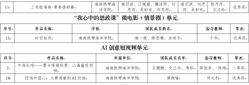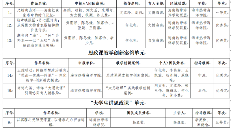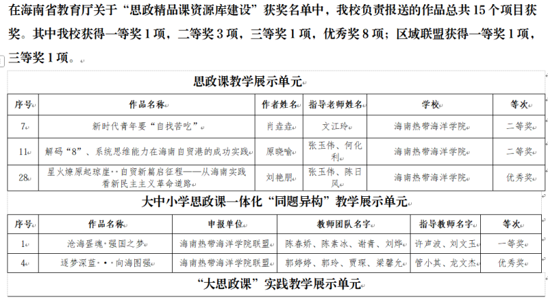 近日,海南省教育厅公布了2025年海南省思政精品课资源库建设获奖名单,海南热带海洋学院报送的作品在多个竞赛单元中表现亮眼,累计斩获15项奖项,其中学校独立完成作品斩获一等奖1项、二等奖3项、三等奖1项、优秀奖8项;我校作为区域联盟牵头单位推荐选送的作品获一等奖1项、三等奖1项,充分体现了我校在思政课建设与改革创新方面的扎实成效,也彰显了我校作为海南省大中小学思政课一体化建设区域联盟牵头单位的示范带动作用。