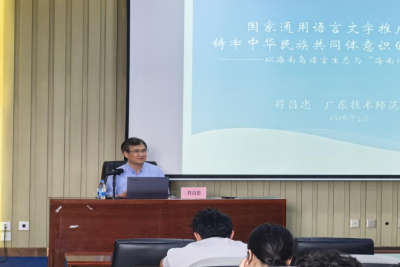 3月20日上午,由我校与三亚市社科界联合会共同主办的“天涯讲坛”学术讲座系列活动2026年度第十三期在人文楼103教室举行。广东技术师范大学符昌忠教授作题为《国家通用语言文字推广普及与铸牢中华民族共同体意识的区域性思考——以海南岛为例》的报告,人文社会科学学院院长王志峰主持讲座。