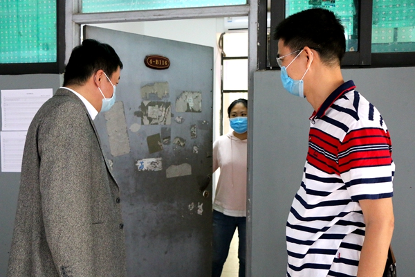 在宿舍隔离区看望学生,陈锐嘱咐他们做好自我防护,戴口罩,勤洗手,多消毒,每天坚持测量体温,注意宿舍开窗通风,保持身心健康,希望同学们增强信心,积极配合学校做好疫情防控工作。