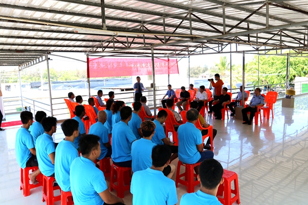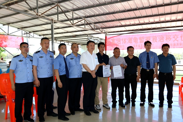 江苏省徐州市人民检察院七部主任王辉、邳州市公安局副局长杨磊、徐州铁路运输检察院副检察长钟帅、徐州市公安局食药环侦支队副大队长赵鹏,海南省农业农村厅渔政渔监处一级主任科员徐刚,三沙市甘泉社区居委会主任许德辉,我校海南省两栖爬行动物研究重点实验室主任林炽贤、水产与生命学院副院长黄海及海龟救助保护基地科研团队参加涉案活体海龟暂养救治移交仪式。