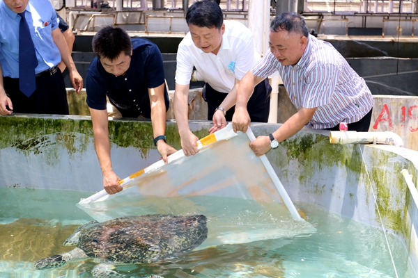 校长陈锐出席涉案活体海龟暂养救治移交仪式,见证相关文件移交,并一起将涉案活体海龟移入暂养水池。