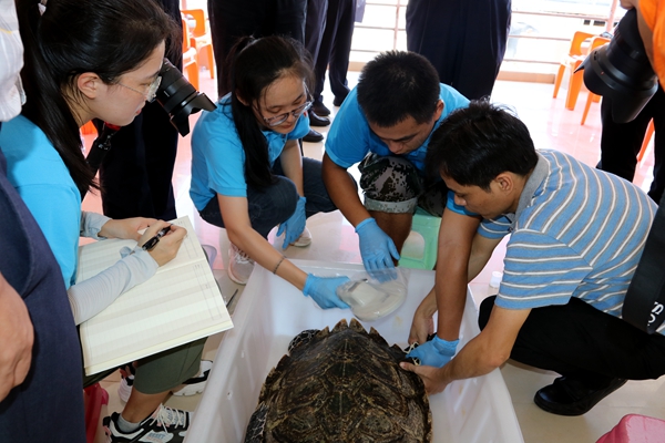 移交后,我校海南省两栖爬行动物研究重点实验室海龟救助保护基地杜宇等成员对涉案活体海龟个体逐一进行健康检查,用电子标签标记个体和建档后,移入暂养水池暂养,对其进行人工救护、野化训练并评估后,将放归海洋。