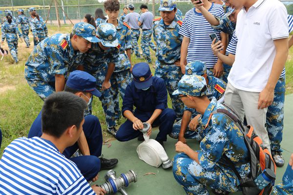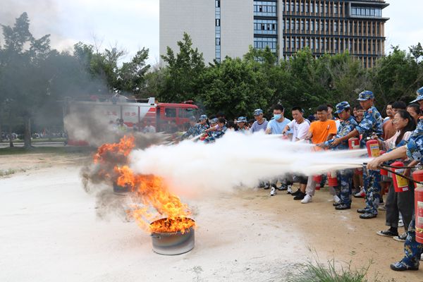消防员现场讲解了干粉灭火器的使用方法,并进行了现场扑救油盆火演示操作。学生代表也进行了灭火实战演练,熟练掌握了干粉灭火器的使用方法。随后消防讲解员讲解了室内消火栓的组成、注意事项并现场演示消防水带的连接方法。
