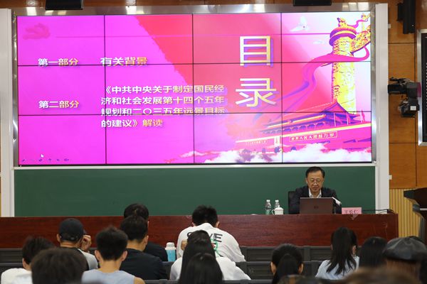 12月24日,党委书记王长仁为我校师生解读党的十九届五中全会精神,讲授了题为《擎画新蓝图 开启新征程》的思政课。王长仁勉励大家要结合自身工作和学习,在学懂弄通做实党的十九届五中全会精神上下功夫,努力为全面建设社会主义现代化国家添砖加瓦。