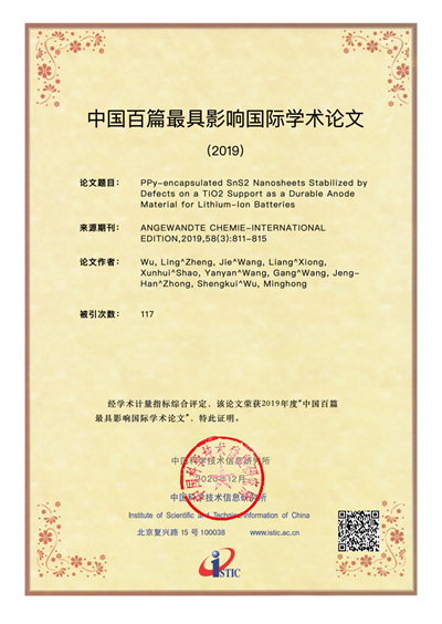 2020年12月29日,国家科学技术部中国科学技术信息研究所在北京举行了2020年中国科技论文统计结果发布会,会上发布了《中国卓越论文统计报告》。我校钟胜奎教授团队的研究工作“PPy-encapsulated SnS2 nanosheets stabilized by defects on TiO2 support as durable anode material for lithium ion battery”入选“2019年中国百篇最具影响国际学术论文”。