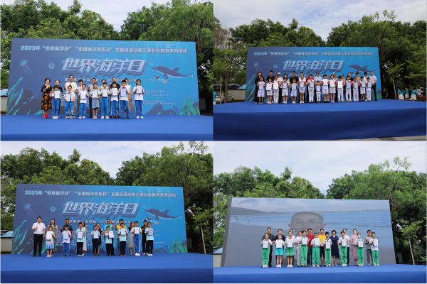 三亚市科协、市关工委、团市委、市教育局有关负责人为第一批“海洋科普小讲解员”颁发证书和奖品。