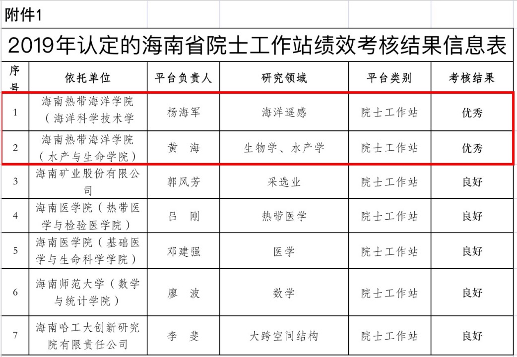海南省科学技术厅关于2019年认定的海南省院士创新平台绩效考核结果的公示http://dost.hainan.gov.cn/xxgk/xxgkzl/xxgkml/202307/t20230719_3457500.html