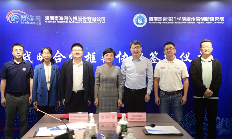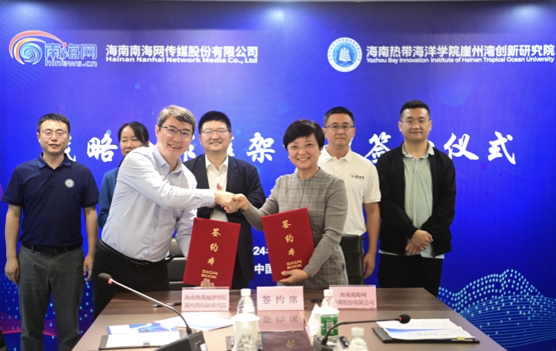 海南南海网传媒股份有限公司副总经理梁刚、三亚分公司总经理助理马伟元,南海网记者沙晓峰、张宏波,海南热带海洋学院崖州湾创新研究院副院长韩秋影及管理人员、科研人员和研究生代表参加签约仪式。