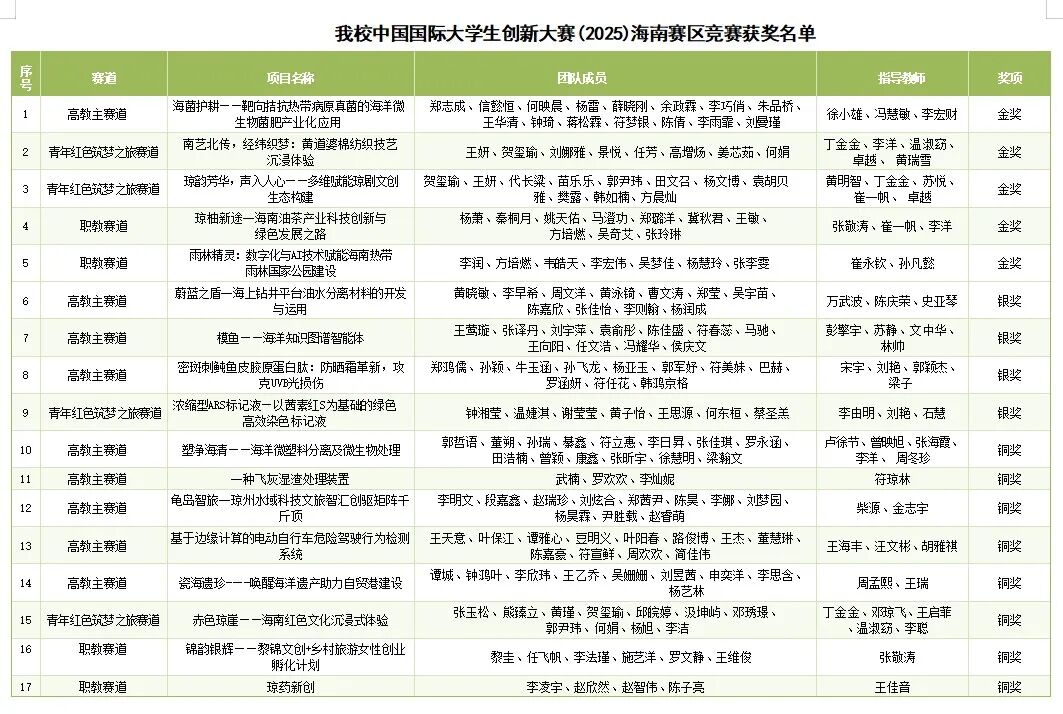 据悉,本届海南赛区竞赛共吸引省内53所高校及产业园区的1.1万余个项目报名参赛。经过激烈角逐,我校共有8个项目脱颖而出,参加中国国际大学生创新大赛(2025)全国总决赛,并在全国总决赛中取得铜奖。