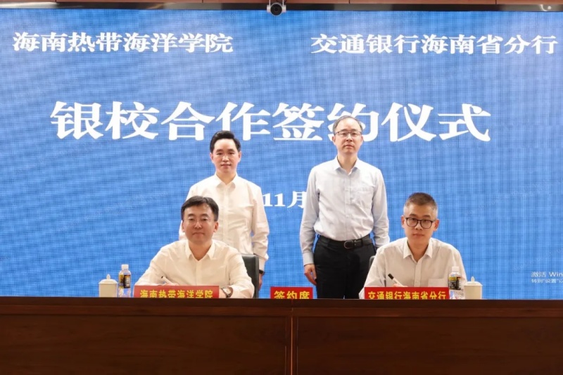 11月24日下午,海南热带海洋学院与交通银行海南省分行银校合作协议签约仪式在交通银行海南省分行举行。校长吕治国,交通银行海南省分行党委书记、行长黄叶峰出席座谈并见证签约,校党委常委、副校长那广水与交通银行海南省分行党委委员朱赫宇代表双方签署合作协议。