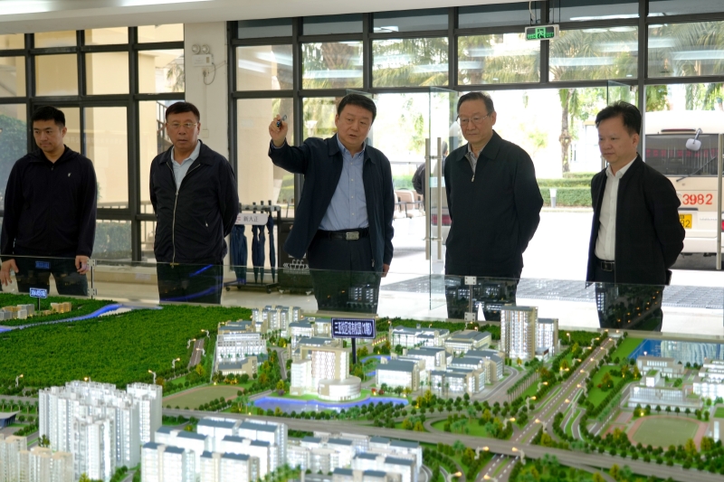 江泽林一行首先参观了学校总体规划沙盘,认真听取了各校区功能布局、建设规划与发展愿景的介绍。在学校三亚校区规划建设关键阶段,江泽林同志曾担任三亚市委主要领导,对学校三亚校区规划建设给予高度重视和大力支持,以前瞻视野和务实举措为校区顺利落地奠定了扎实基础。如今,沙盘上呈现的楼宇林立、绿意盎然的校园格局,正是当年擘画蓝图逐步变为现实的生动体现。