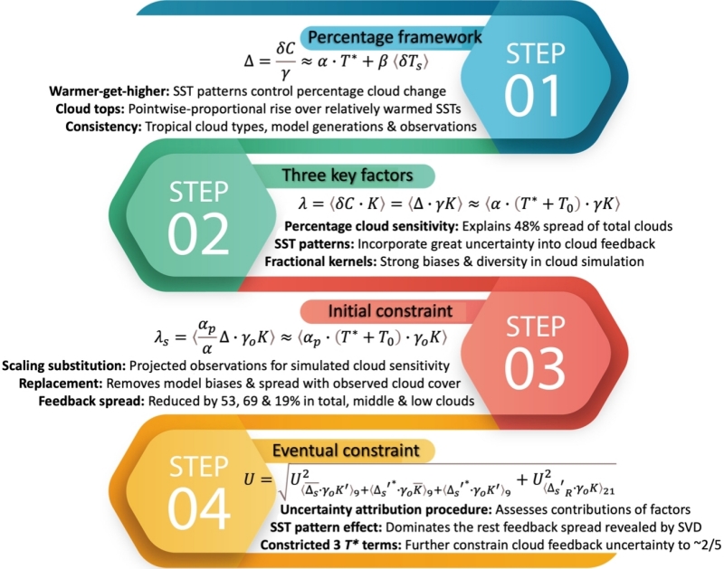 六载铸一剑,霜刃显锋芒。”针对气候预估最大困境,经过呕心沥血艰苦奋斗提出了创新理论范式“比例暖者更高”,揭秘了云量百分比变化与海表增暖型关联。继而成功设计出高效解决方案,包括分析框架、归因程序和涌现约束,显著降低云辐射反馈的不确定性。学术成果的最终发表,标志着中国学者在未来气候变化的云辐射反馈前沿领域,再次领衔跨界研究,取得里程碑式的关键突破!