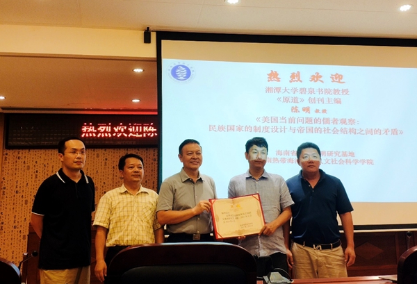 5月8日下午,湘潭大学碧泉书院教授、《原道》(CSSCI)创刊主编陈明,在我校图书馆报告厅作题为“美国当前问题的儒者观察:民族国家的制度设计与帝国的社会结构之间的矛盾”的学术讲座。副校长廖民生出席并为陈明颁授了海南省南海文明研究基地研究员聘书。讲座由人文社会科学学院副院长方礼刚主持。国际事务与国际关系系及海南省南海文明研究基地等相关人员200余人参加讲座。