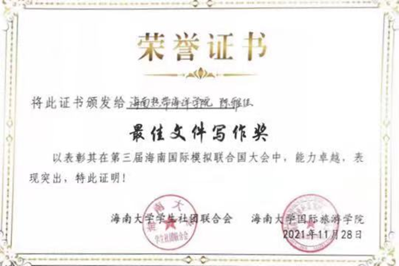 我校模拟联合国社团(南屿模拟联合国协会)受到学校共青团委员会和校领导的重视和支持,代表队在指导老师黄田园的带领下赴海南大学参与线下会议,努力向全国一流模拟联合国团体及优秀代表看齐,各位代表在各分会场中积极踊跃表现,展示我校学生的风采,代表海南热带海洋学院与其他高校代表共同努力,收获了来自大会主办方、学术团队和其他代表的一系列好评与点赞。其中,陈雅佳同学荣获大会最佳文件写作奖。