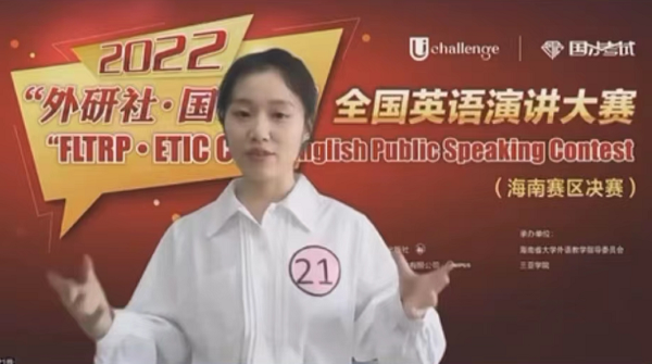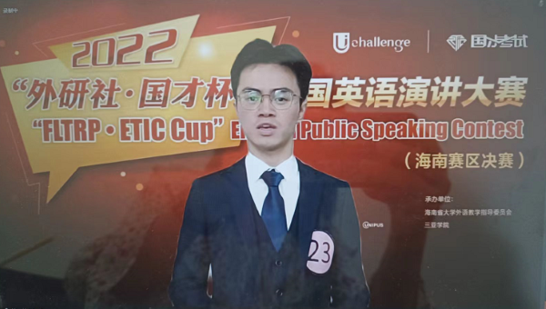 2022年第二十三届“外研社·国才杯”全国英语演讲大赛、阅读大赛、写作大赛海南赛区决赛于11月11-12日圆满落幕,我校学子在此次赛事活动中喜获佳绩,外国语学院学生段帆格摘得阅读大赛特等奖。并将代表海南省角逐全国总决赛。