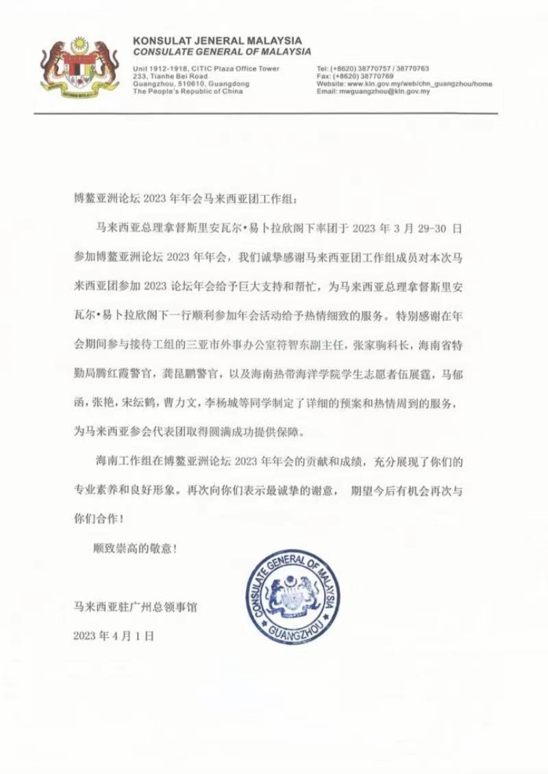 参与服务具有如此巨大影响力的国际盛会,对语言类学生来说是非常重要和宝贵的锻炼机会。为此,英语专业老师陈钦炳积极联系三亚市外事办公室,为同学们争取到为马来西亚来访团进行志愿服务的机会。在学院党政领导的高度重视和精心指导下,课程负责人杨洁精心遴选伍展霆、马郁函、张艳、宋纭鹤、曹力文和李杨城同学参与志愿服务工作。在陈钦炳的带领下,他们以良好的专业素养和高昂的精神状态很好地完成了由马来西亚总理拿督斯里安瓦尔·易卜拉欣阁下率领的马来西亚代表团的随团服务工作,受到代表团高度肯定和赞扬,并在会后收到了马来西亚驻广州总领事馆发来的感谢信。