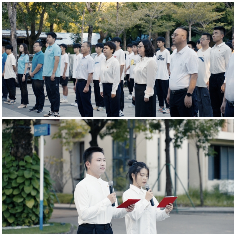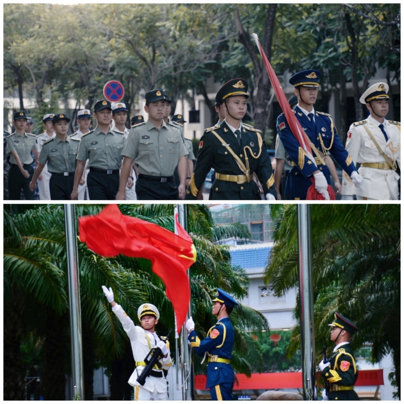 11月6日早上7点,人文社会科学学院与国际航海学院在行政楼广场联合举行“国旗飘扬 文明成长”主题升国旗仪式。人文社会科学学院党委书记郑力乔、院长王志峰、副书记黄宇志、副院长杨超以及两个学院的全体辅导员、学生党员代表、2023级全体新生参加升国旗仪式。本次升旗仪式由人文社会科学学院2021级学生钟天放与国际航海学院2023级学生许奇瑞共同主持。