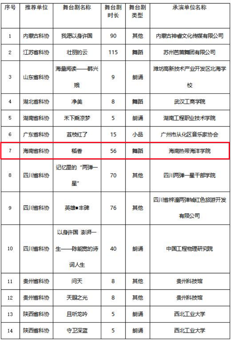 12月1日,由中国科学协会、教育部、共青团中央、中国科学院、中国工程院、中国文联共同主办的“科学家故事舞台剧推广行动”首批名单正式公布。由我校艺术学院舞蹈编导专业教师刘璐、何世飞、张宇携2018级学生创排的舞剧《稻香》成功入选科学家故事舞台剧特色推广名单。