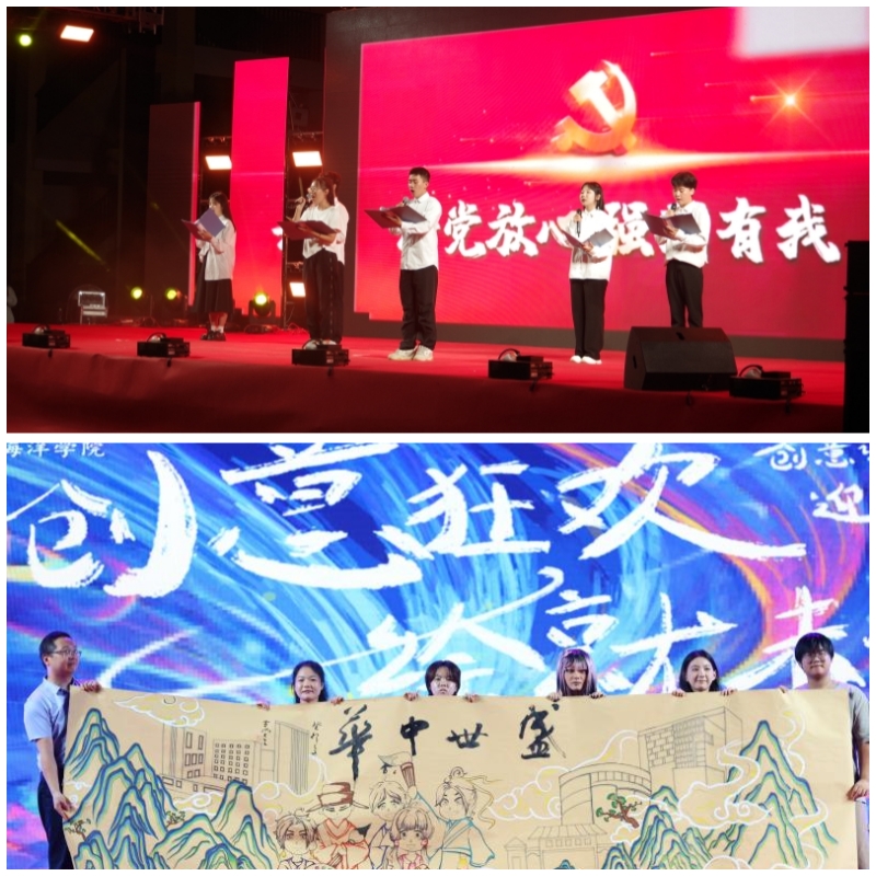 第三篇章为“青青子衿 志怀家国”,着重表现出学子报效祖国的坚定信念。其中,黄荣生老师在现场为画作提写“盛世中华”,关义觉老师进行精彩点评。这幅师生联动的画作,展现出青年学子醇熟的作画技巧和高尚的报国情怀。学院党总支书记朱海冰的一曲《半个月亮爬上来》将晚会推向高潮。