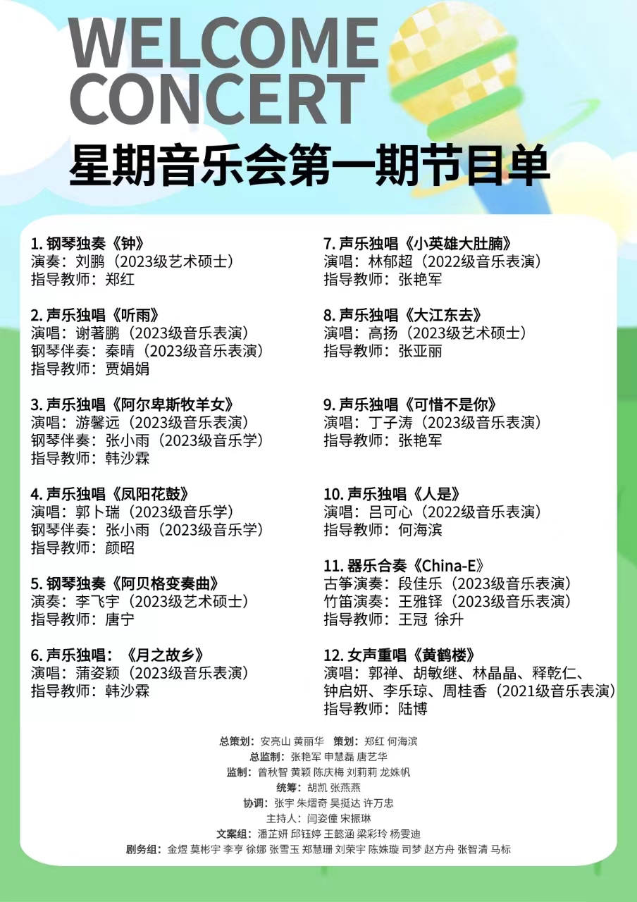 据悉,“星期音乐会”是艺术学院为学生搭建的舞台实践平台,目的是提升学生舞台实践能力和课程教学质量,完善学科专业课程体系构建。每期演出节目由专业课教师指导学生自行申报,重点体现专业课程学习成果。音乐会文案、剧务等工作均由实践课程组的老师引导学生们完成,既提升了学生的活动参与度,又增强了学生多方位的艺术实践能力,为音乐会顺利筹备和运行提供有力保障。学生参与音乐会情况将纳入相关课程成绩评定。