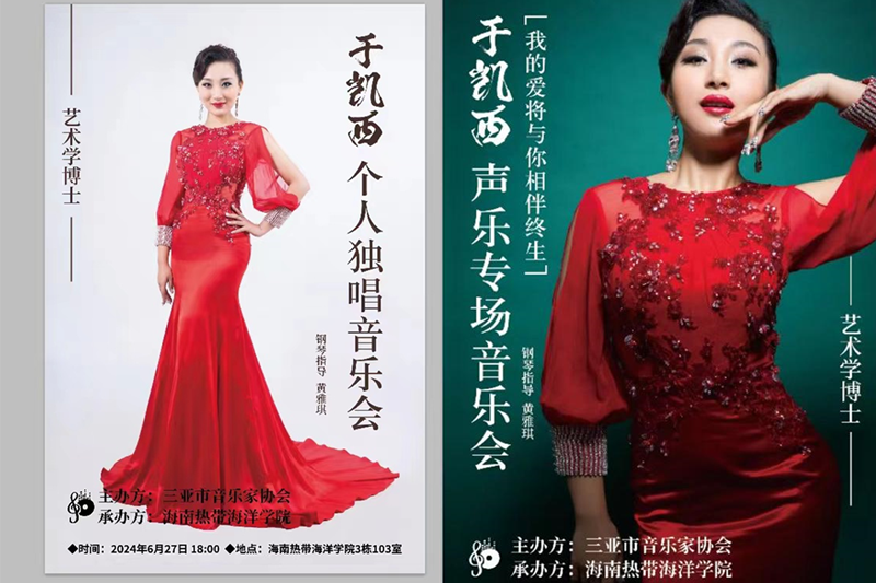 6月27日和28日,民族学院教师于凯西在我校3栋103教室分别举办“于凯西个人独唱音乐会”“我的爱将与你相伴终生”声乐专场音乐会,艺术指导为我校民族学院教师黄雅琪。海南省音乐家协会副主席黄远舫,民族学院院长张朔人、党委书记吴启学、副院长周述波、副院长邓琼飞,艺术学院党总支书记黄丽华、副院长郑红、首席专家安亮山及师生参加音乐会。