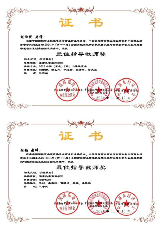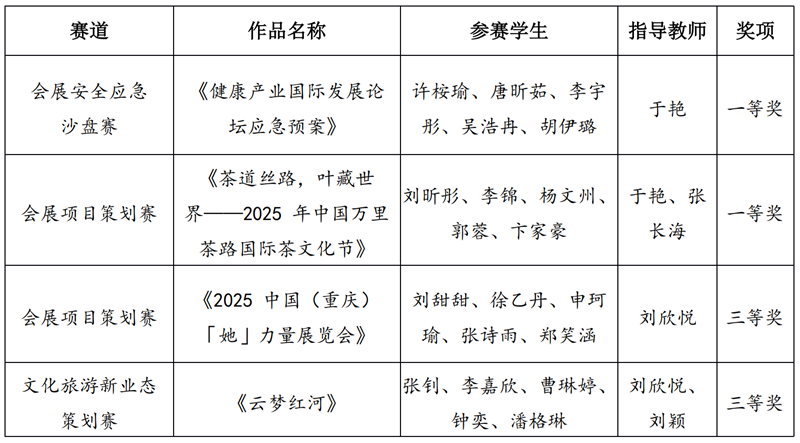 此外,于艳和张长海两位老师指导的《茶道丝路,叶藏世界——2025 年中国万里茶路国际茶文化节》获得会展项目策划赛一等奖,刘欣悦老师指导的《2025中国(重庆)「她」力量展览会》获得会展项目策划赛三等奖,刘欣悦和刘颖两位老师指导的《云梦红河》获得文化旅游新业态策划赛三等奖。学校还获得最佳院校组织奖。