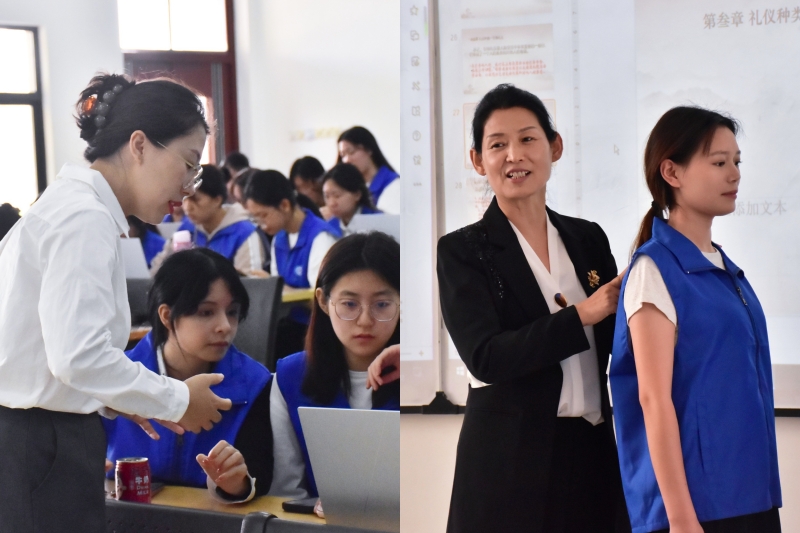 培训现场刘茹霞(左)、郝春梅(右)对志愿者们进行现场指导