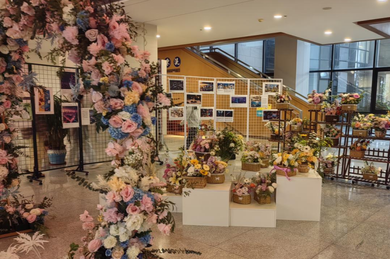 本次展览共设“AI科技绘图”与“传统插花艺术”两大板块,以“科技与传统共生、创意与美育相融”为主题,集中呈现学生AI绘画作品与师生插花艺术创作。展出的近百件AI作品构思巧妙,既有融合海南热带风情与未来科技的奇幻画面,也有将黎锦纹样等本土文化元素与赛博朋克风格相结合的创新尝试。这些作品均由学生借助AI技术平台实现创意,展现出我校学子对未来的多元想象与技术运用能力。而插花艺术展区,师生以花为媒,融入虚实相生的东方美学,巧妙结合黎族编织的对称韵律与海洋文化的灵动意象,引领观众在花香雅韵中沉浸体验传统文化的当代魅力。
