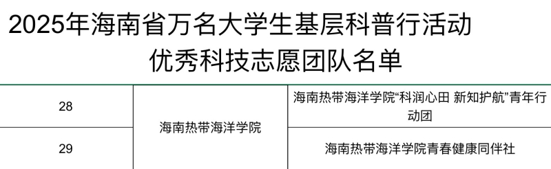 近日,海南省科学技术协会、中共海南省委精神文明建设办公室、海南省教育厅、中国共产主义青年团海南省委员会联合印发《关于表扬2025年海南省万名大学生基层科普行活动优秀组织单位、优秀科技志愿团队及优秀科技志愿者的通报》(琼科协〔2025〕66号),我校凭借在基层科普工作中的突出表现,斩获多项荣誉,彰显了学校在科技志愿服务与人才培养中的扎实成效。