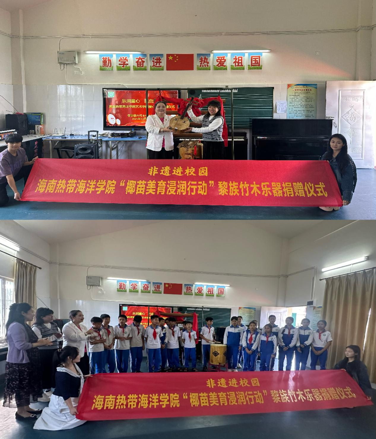 11月19日,海南热带海洋学院“椰苗美育浸润行动”黎族竹木乐器捐赠仪式先后走进保亭县六弓乡中心学校和五指山通什中心学校,将承载黎族文化底蕴的传统乐器送到乡村学校孩子手中。艺术学院党委书记黄丽华带队,副院长申慧磊,陈颖、杨霖老师参与活动,用实际行动助力乡村美育发展。