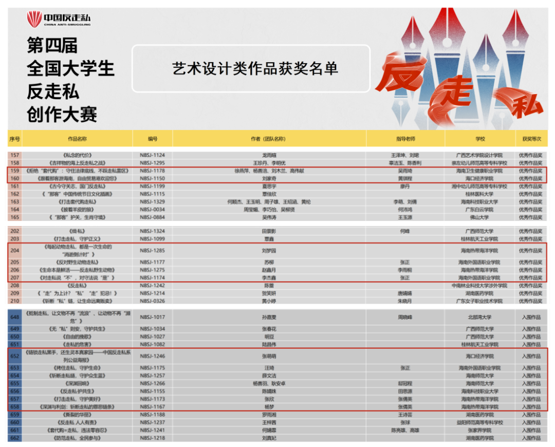 近日,第四届全国大学生反走私创作大赛获奖名单正式公布,海南热带海洋学院师生作品斩获8项全国级奖项,其中全国艺术设计类优秀奖2项、入围奖2项,全国综合类优秀奖1项、入围奖2项,全国视频类入围奖1项。