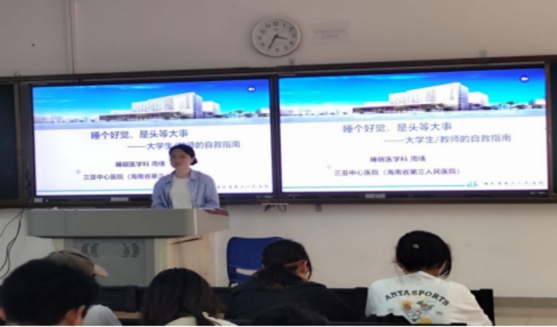 讲座中,三亚中心医院睡眠医学科周倩医生围绕“睡个好觉,是头等大事”主题展开系统讲解。她通过现场提问与互动调查,精准了解在场学生的睡眠现状,并针对“熬夜补觉”“睡前刷手机无害”“打鼾即睡得香”等常见认知误区进行逐一纠偏,帮助学生建立科学的睡眠认知体系。为增强参与感与自我筛查能力,讲座播放了睡眠障碍科普视频,并发放了标准化睡眠自评量表,引导学生对照自身情况进行初步评估。在睡眠障碍干预环节,周倩医生带领学生现场体验“正念呼吸”与“身体扫描”两项循证心理疗法,传授无需药物、可随时应用的自我调节技术。最后,她系统归纳了营造优质睡眠环境的实用技巧,包括光照控制、温度调节、睡前仪式建立等,并郑重提醒学生:若长期存在入睡困难、早醒、日间功能受损等问题,应及时寻求专业医疗帮助。本环节有效纠正了学生的睡眠认知偏差,提升了自我筛查与调适能力,取得了良好的科普与干预效果