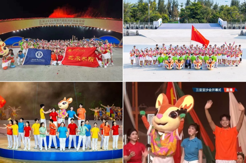 四月的三亚,热情似火。备受瞩目的第十六届亚洲沙滩运动会开幕式在欢呼声中圆满落幕。我校艺术学院82名学子圆满完成了开幕式文艺演出任务,他们以青春与活力,向世界展示了中国青年的风采。